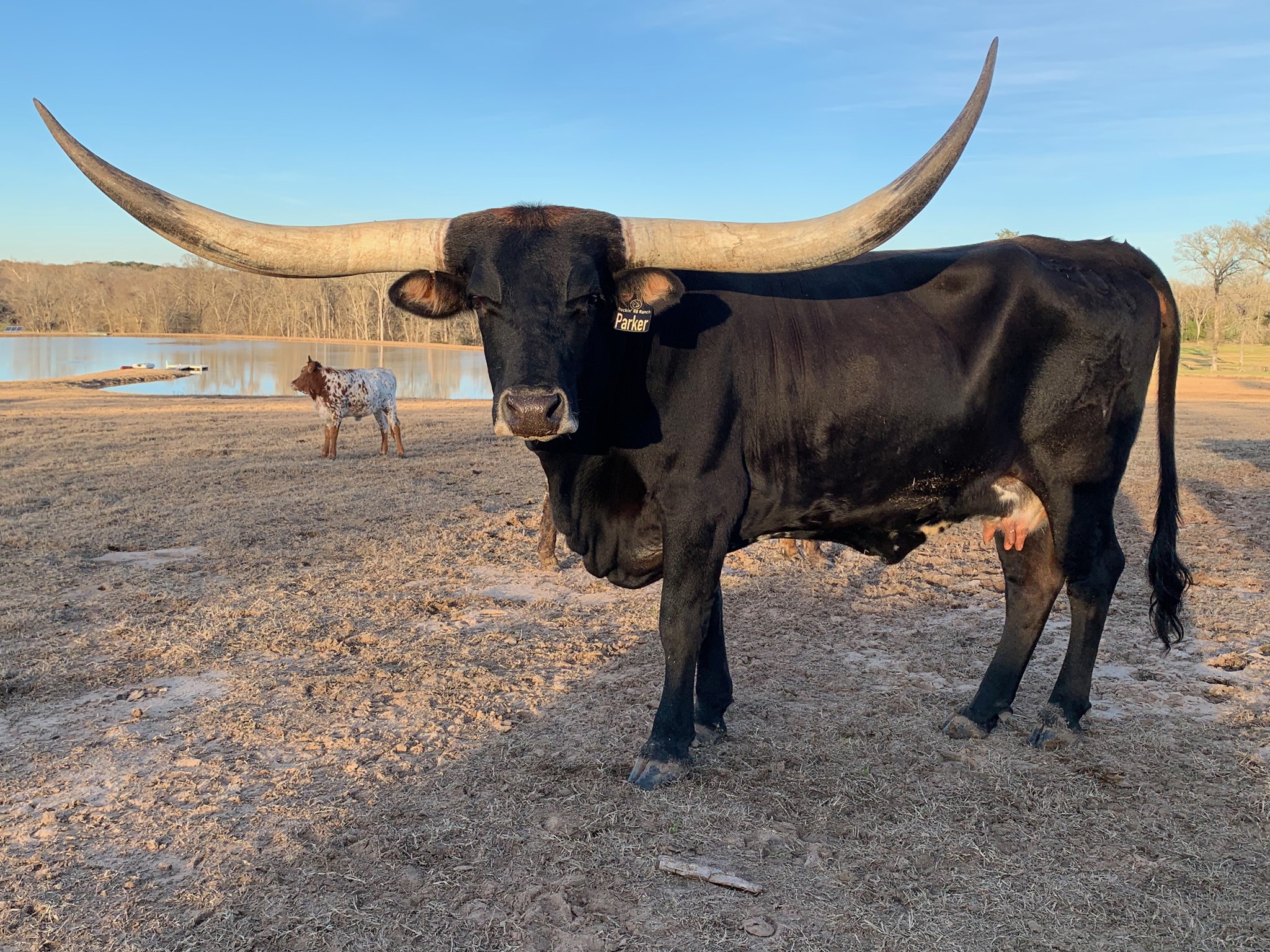 Star of Incandescence is lovingly known on the ranch as Parker. Her striking parker brown makes her shine bright in the pasture. She has produced 2 beautiful calves for us. Her 2021 calf is on his way to being a trophy steer with a thick horn base, length, and parker brown color. Parker's horns have continued to grow and twist as her years go on. This 2015 cow has a calm and easygoing temperament. She enjoys having a treat (or two) on a beautiful afternoon.