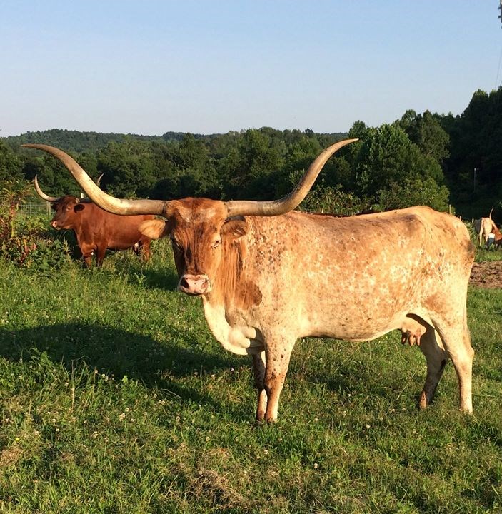 OCV'd. "Susan" is my #1 producer, she out produces herself every year!! She's dog gentle and loves to be scratched. She is the dam of DNA Independence Day who sold at 2012 HSC for $8750; and of DNA Rio Diego's Rivera. She throws HORN! If she were bred by a Golden Retriever the litter would have horns! All her off-spring have color, horn, and great dispositions, most brindle or roan.